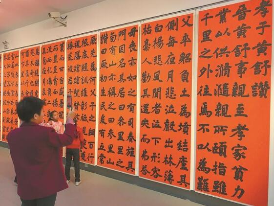 據(jù)了解,此次展覽不同于普通的書法展,而是以“孝德”為內(nèi)容的主題創(chuàng)作展,所有作品都圍繞孝文化進行創(chuàng)作,每一幅作品都在講述一個關(guān)于孝文化的故事。在“孝德”大主題下,又分了幾個小專題,比如“二十四孝專題”“孝經(jīng)專題”“金石題跋專題”,還有本土的“孝德寶安專題”。當(dāng)天的展覽吸引了大量觀眾,不少觀眾還帶著小孩參觀,黃女士告訴記者,“今天帶著小孩來,一是欣賞書法,二是希望小孩了解一下傳統(tǒng)的孝德文化,我們通過書法還了解到寶安孝子黃舒的故事?!?/p>
