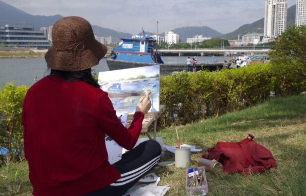 優(yōu)美的景色映入畫家們眼簾,點(diǎn)燃了他們的創(chuàng)作激情。來到鹽田之后,藝術(shù)家們紛紛找好寫生地點(diǎn),擺好畫架,迅速進(jìn)入創(chuàng)作的狀態(tài)。他們當(dāng)中一部分來到了鹽田漁港,鹽田海鮮街后的小漁村避風(fēng)港。蔚藍(lán)的大海、旁邊的綠樹、避風(fēng)塘內(nèi)停泊的船只、白色的海鳥、釣魚的人以及遠(yuǎn)方火熱的建設(shè)場景都呈現(xiàn)在畫家的筆端;另一部分藝術(shù)家來到了位于三洲田深圳會計進(jìn)修學(xué)院的梧桐溪谷,小橋流水人家、奇石山林則一一被傾注于畫紙。