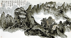 王和平不僅能書寫2尺的大字,還能寫篆書、隸書、行書、草書、楷書,他尤其擅長以指書寫長線條幅,還能書寫小到1寸左右的楷書、行書、草書等各種書體?!皬乃摹饵S山系列》,我看到了一個(gè)堅(jiān)強(qiáng)的古典腳步,追尋在范寬的《谿山行旅途》中,沐李唐的《萬壑松風(fēng)圖》,聽馬遠(yuǎn)的《踏歌圖》……一個(gè)精美絕倫的藝術(shù)時(shí)代遠(yuǎn)逝而去,念天地之悠悠,獨(dú)愴然而涕下。留幽幽懷古者,追憶圣賢高士清歌古琴于卷軸中的絕美風(fēng)騷。王和平和我都是這個(gè)幽幽懷古者,追求高貴古典精神的尋賢之人?!边@是評(píng)論家豐川在他的《心有千像,十指墨弦》一文中評(píng)價(jià)王和平的指書所述。