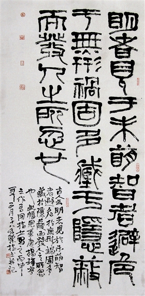 王和平以手指蘸墨,以手為筆,或疾或緩,不到十分鐘,一幅恰似石鑿雕刻力透紙背的書法作品躍然紙上,其變幻莫測的創(chuàng)作手法和獨(dú)特風(fēng)格令人叫絕。顯然,用手指畫的難度比用筆畫大得多。一般書寫一個(gè)字需要用手指蘸墨幾次以上,但又必須使字形整體合理自然,筆畫形式流暢靈動(dòng),不至于顯露手工痕跡,不至于給人以呆滯和工藝性強(qiáng)的感覺。要恰到好處地體現(xiàn)筆畫的緊湊、粗細(xì)、虛實(shí)、枯榮,是一件很不容易的事。功夫全在指頭,既非一日之功,也非人人可以練就。