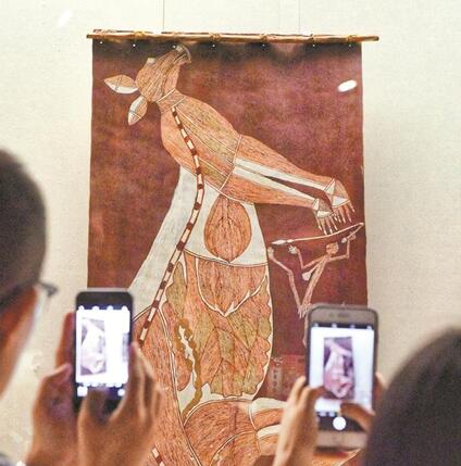 樹皮畫是人類一項(xiàng)古老的藝術(shù),也是澳大利亞原住民延續(xù)保留至今的一種藝術(shù)形式。澳大利亞的樹皮畫承載了深厚的文化和思想內(nèi)涵,被稱為是“活著的”原始繪畫。本次展覽展示了位于澳大利亞北海岸線的阿納姆地原住民藝術(shù)家創(chuàng)作的120余件樹皮繪畫,以及繪制工具、木雕木刻等,反映了澳大利亞原住民對世界的理解和認(rèn)識,以及他們的生活習(xí)俗、精神世界與文化傳統(tǒng),也展現(xiàn)了澳大利亞原始藝術(shù)的鮮明特色。