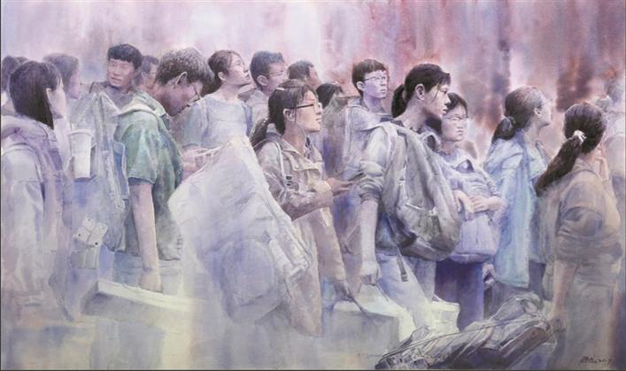 藝術(shù)家方曉龍此次有兩件作品入選,分別是水彩畫《追夢(mèng)》和與青年藝術(shù)家張凱合作的油畫《掠過晨曦的夢(mèng)想》。兩幅作品聚焦同一主題——青年學(xué)子參加藝考,這來自他對(duì)這一題材長(zhǎng)年累月的觀察。