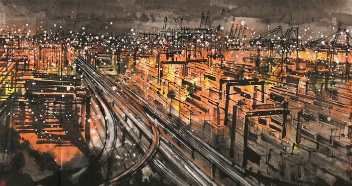 楊曉洋創(chuàng)作的《東方巨港——璀璨鹽田》是此次入選的國(guó)畫作品之一。作品以深圳港夜色為主題,體現(xiàn)了中國(guó)改革開放前沿城市深圳滄海桑田的巨變和這座城市的繁榮景象。同樣是表現(xiàn)現(xiàn)代題材的城市景觀,從楊曉洋的作品中就可看出以對(duì)版畫的黑白對(duì)比手法、平面構(gòu)成的象征形式、夜景特色的表現(xiàn)手法的出色運(yùn)用等方式來表達(dá)出作者對(duì)都市景觀的趣味。