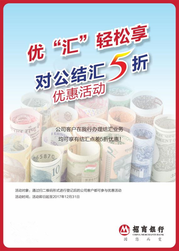 近日,記者從招行深圳分行了解到,自2017年8月1日至2017年年底,招商銀行深圳分行特別推出結(jié)匯尊享優(yōu)惠活動?;顒悠陂g,凡公司客戶,可在招商銀行深圳分行轄內(nèi)(含珠海分行及惠州分行)任一網(wǎng)點通過掃描指定二維碼進(jìn)行登記,登記后辦理結(jié)匯業(yè)務(wù)即可享受結(jié)匯點差五折優(yōu)惠。(張怡)