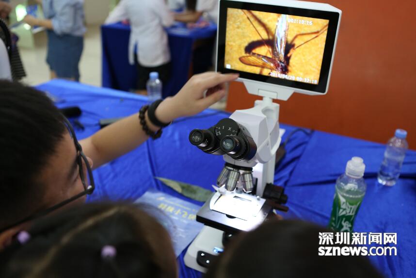 現(xiàn)場孩子們在顯微鏡下觀察昆蟲
