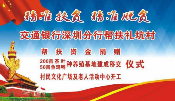 自交通銀行深圳分行對(duì)口幫扶禮坑村,開展"雙精準(zhǔn)"扶貧以來(lái),禮坑的經(jīng)濟(jì)社會(huì)發(fā)展和村容村貌發(fā)生顯著變化,積貧積弱的小山村呈現(xiàn)欣欣向榮的新氣象。積土成山、積水成淵,200畝茶山破土而出、蔚然成綠,50畝養(yǎng)殖基地竣工落成、生機(jī)勃勃,三萬(wàn)魚苗、數(shù)千雞苗茁壯生長(zhǎng),村民文化廣場(chǎng)、老年活動(dòng)中心、道路硬底項(xiàng)目、山村亮燈工程躍然紙上,逐次開工建設(shè),禮坑正創(chuàng)造并綻放新的希望,村民笑容淳厚,各級(jí)由衷點(diǎn)贊。紫金縣領(lǐng)導(dǎo)、縣扶貧工作總負(fù)責(zé)人廖振輝表示:"交通銀行深圳分行是真重視、真扶貧、扶真貧,在對(duì)口紫金的扶貧單位中首屈一指,無(wú)論在河源市的扶貧工作考評(píng)中,還是在代表河源參加的廣東省扶貧工作考評(píng)中,雙雙獲得優(yōu)秀評(píng)價(jià),真誠(chéng)感謝交行,紫金要和交行一起努力,讓禮坑成為社會(huì)主義新農(nóng)村示范村建設(shè)中的示范點(diǎn)"。