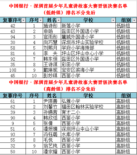 從全市近百所學(xué)校、社會(huì)賽區(qū)報(bào)名的萬余名參賽選手中脫穎而出的選手們齊聚復(fù)賽賽場(chǎng),比賽競(jìng)爭(zhēng)異常激烈。晉級(jí)復(fù)賽的225人(其中高齡組104人,低齡組121人)使出渾身解數(shù),講述著自己喜歡的故事,最終高、低齡組每組各10人晉級(jí)決賽,低齡組新蓮小學(xué)施詩彤、鹽田區(qū)外國(guó)語小學(xué)申旸等10位選手,高齡組弘雅小學(xué)尹琪善、福田區(qū)翰林實(shí)驗(yàn)學(xué)校劉馨竹等10位選手“殺出重圍”,奪得決賽名額。