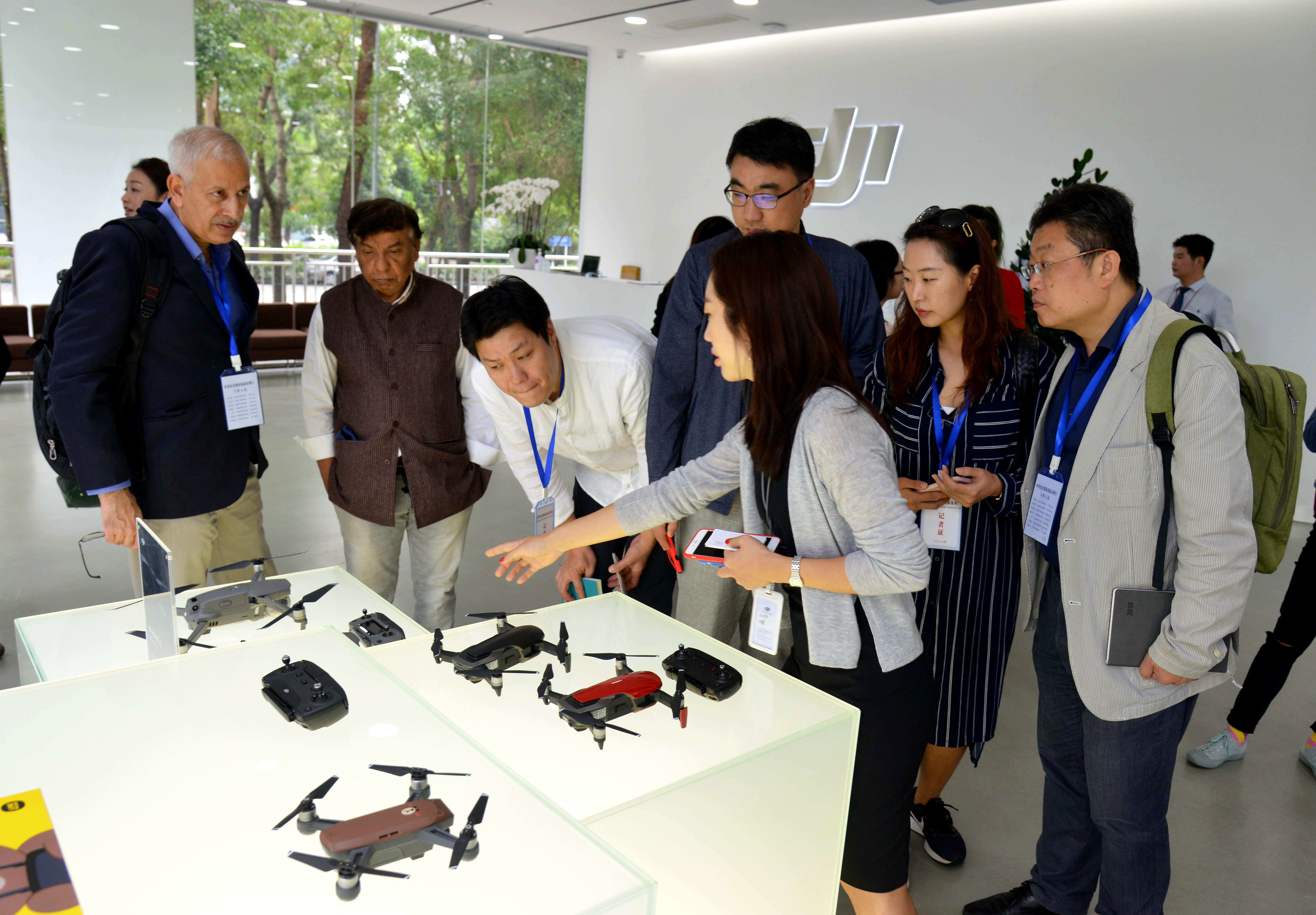 各國(guó)記者們?cè)诖蠼畡?chuàng)新科技有限公司參觀無(wú)人機(jī)產(chǎn)品。