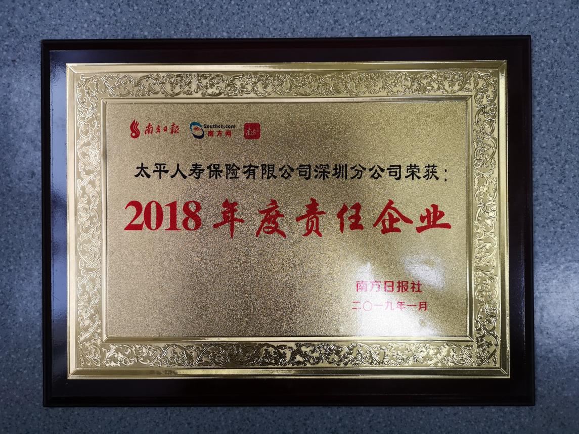 深圳新聞網(wǎng)訊 1月14日,由南方報業(yè)傳媒集團(tuán)主辦,深圳市慈善事業(yè)聯(lián)合會、深圳市慈善會、深圳市社會公益基金會、同心俱樂部、深圳市保險同業(yè)公會聯(lián)合主辦,南方日報珠三角全媒體新聞部承辦的2019南方日報深圳企業(yè)社會責(zé)任峰會在深圳召開。太平人壽深圳分公司從百余家企業(yè)中脫穎而出,榮獲“2018年度責(zé)任企業(yè)”榮譽(yù)獎項。