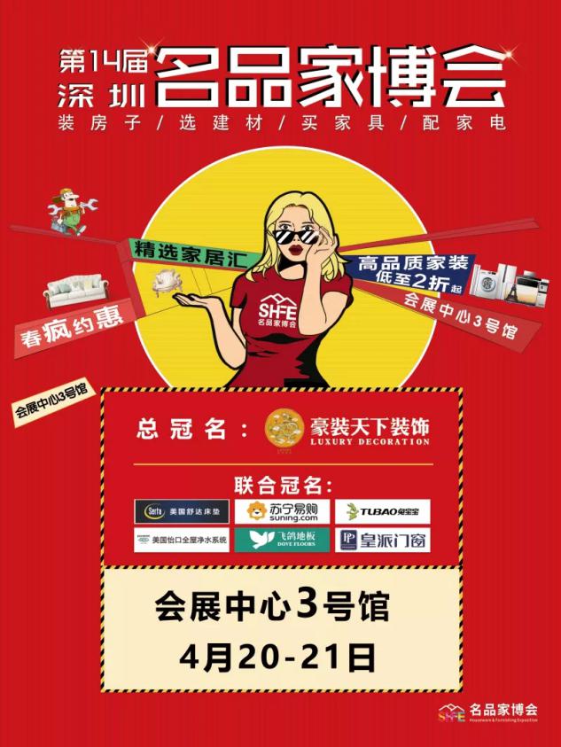 ?由豪裝天下裝飾集團(tuán)總冠名并聯(lián)合蘇寧易購(gòu)、美國(guó)舒達(dá)床墊、飛鴿地板、皇派門窗共同助力的第14屆深圳名品家博會(huì),將于4月20日—21日舉行在深圳會(huì)展中心舉辦。