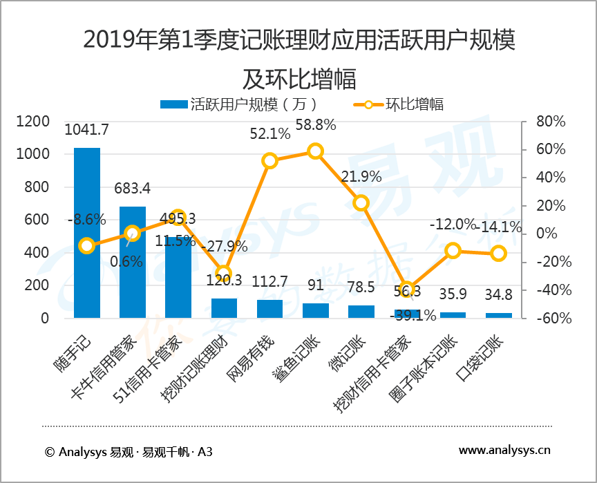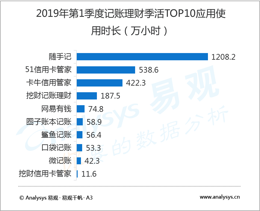 5月24日,知名互聯網數據研究機構易觀 Analysys發(fā)布了2019年第1季度記賬理財行業(yè)報告,數據顯示,2019年第1季度,在國內記賬類應用中,隨手記以1041.7萬活躍用戶規(guī)模蟬聯榜首,卡牛信用管家和51信用卡管家分別以683.4萬和495.3萬活躍用戶規(guī)模居行業(yè)二、三位。