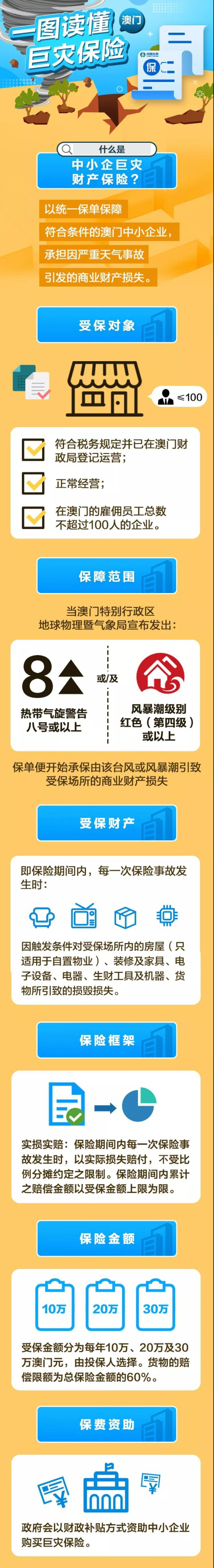 7月31日,今年首個(gè)臺(tái)風(fēng)“韋帕”來(lái)襲,香港、澳門氣象部門相繼懸掛8號(hào)風(fēng)球,并發(fā)布黃色風(fēng)暴潮警告。在持續(xù)強(qiáng)降雨和大風(fēng)之際,澳門金融管理局和經(jīng)濟(jì)局舉行聯(lián)合新聞發(fā)布會(huì),宣布推出“中小企巨災(zāi)財(cái)產(chǎn)保險(xiǎn)”,為中小企業(yè)在8號(hào)風(fēng)球/紅色風(fēng)暴潮或以上警告期間,所遭受的商業(yè)財(cái)產(chǎn)損失提供保險(xiǎn)保障。中國(guó)太平旗下太平澳門簽出中小企巨災(zāi)財(cái)產(chǎn)保險(xiǎn)第一單,為當(dāng)?shù)刂行∑髽I(yè)帶來(lái)定心丸。