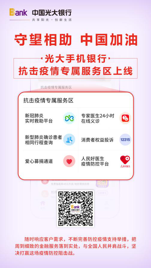 深圳新聞網(wǎng)2月5日訊 近日,記者從光大銀行獲悉,為降低疫情傳播性,讓光大銀行客戶能快速查找到疫情相關(guān)重要信息,讓客戶的愛心能第一時(shí)間傳達(dá)到抗疫一線的斗士們手中,光大手機(jī)銀行火速上線抗擊疫情專屬服務(wù)區(qū)。