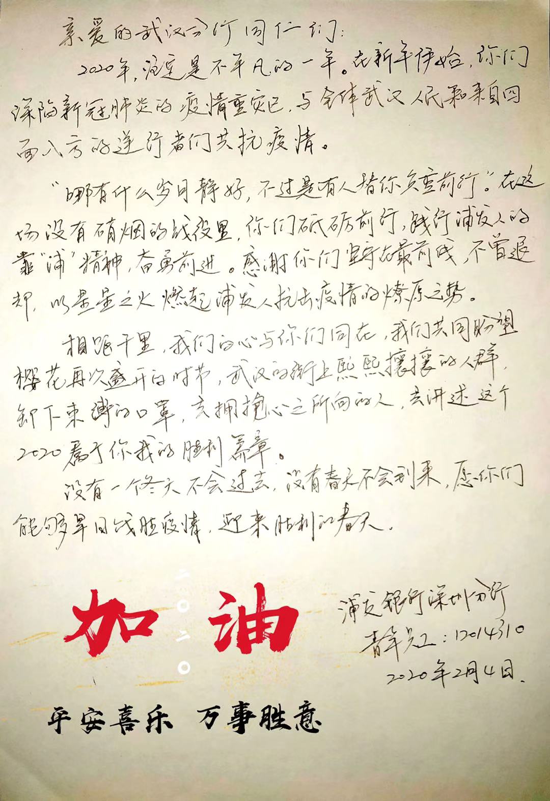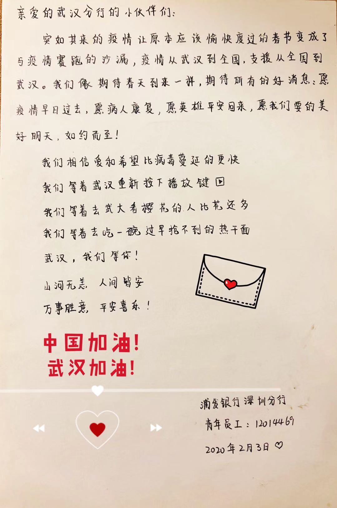 2月3日,浦發(fā)銀行深圳分行團(tuán)委向全體青年員工發(fā)出了一封倡議書。在倡議書中,該行團(tuán)委號(hào)召?gòu)V大團(tuán)干部、團(tuán)員青年立即行動(dòng),充分發(fā)揮黨的助手和后備軍作用,展現(xiàn)青年突擊隊(duì)作為,為堅(jiān)決打贏疫情防控阻擊戰(zhàn)貢獻(xiàn)力量,并向青年提出三個(gè)要求:“堅(jiān)定信心不迷茫,聽黨指揮勇?lián)?dāng)”、“科學(xué)防范不信謠,眾志成城控疫情”、“居家辦公不離崗,服從指揮勇?lián)?dāng)”。當(dāng)日,浦發(fā)銀行深圳分行發(fā)起了給武漢分行同事寄送家書的活動(dòng),該行全體青年手寫家書,圖文并茂、紙短情長(zhǎng),表達(dá)了對(duì)疫區(qū)“戰(zhàn)友們”最深切的關(guān)愛和鼓勵(lì),身體力行做好他們堅(jiān)強(qiáng)的后盾。