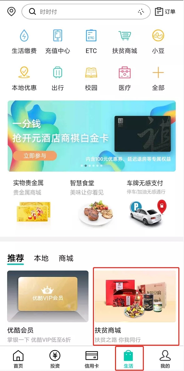 打開農(nóng)行掌銀APP,點(diǎn)擊“生活”-“扶貧商城”