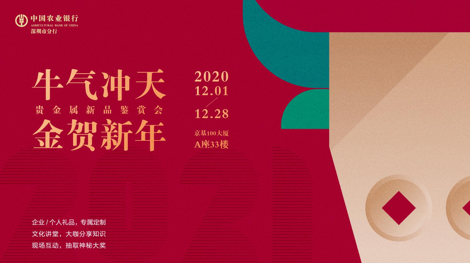 深圳新聞網(wǎng)·見圳客戶端2020年12月1日訊 為滿足客戶的多元化贈禮、收藏、投資需求,為客戶提供個性化定制服務,2020年12月1日至28日,深圳農(nóng)行在京基100大廈A座33樓舉辦“牛氣沖天·金賀新年”貴金屬新品鑒賞會。