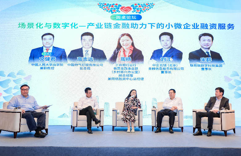 在論壇對話環(huán)節(jié),工行總行普惠金融事業(yè)部副總經(jīng)理兼網(wǎng)絡(luò)融資中心總經(jīng)理周楊、核心企業(yè)代表中國燃?xì)饪毓捎邢薰靖笨偛酶咧具h(yuǎn)、供應(yīng)鏈服務(wù)機(jī)構(gòu)代表中企云鏈(北京)金融信息服務(wù)有限公司董事長劉江和聯(lián)易融數(shù)字科技集團(tuán)董事長宋群共同探討了如何以融合和創(chuàng)新方式,通過產(chǎn)業(yè)鏈金融助力小微企業(yè)融資服務(wù),互相交換在產(chǎn)業(yè)鏈金融發(fā)展方面的經(jīng)驗和智慧。