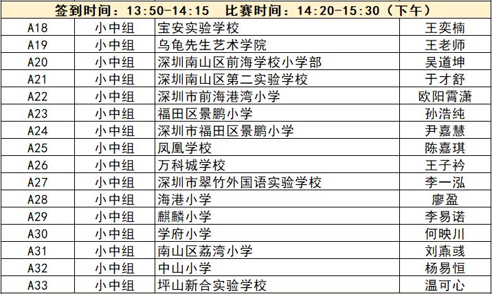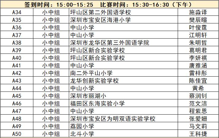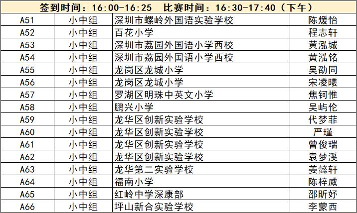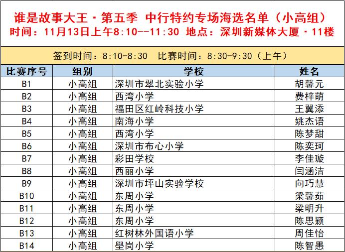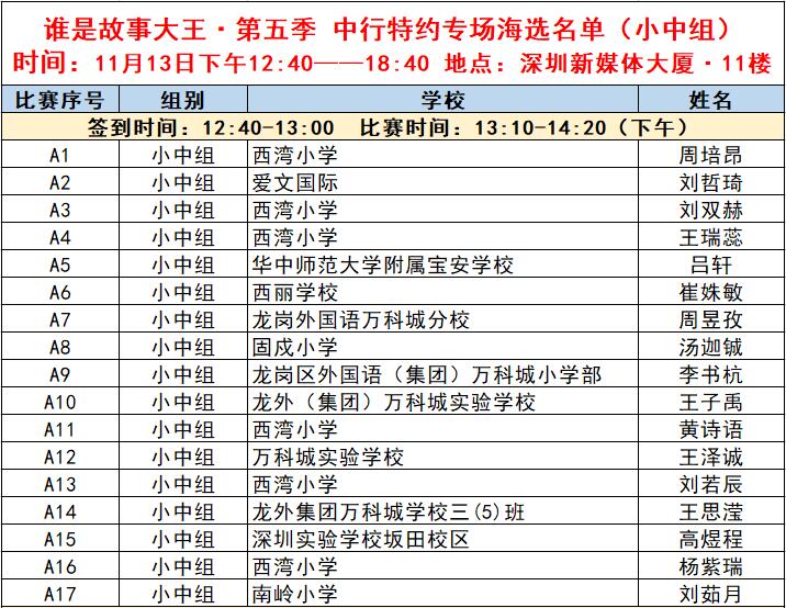“誰(shuí)是故事大王·第五季”分為小中組和小高組,此次中行特約專(zhuān)場(chǎng)海選報(bào)名的學(xué)生將以脫稿的形式,不限主題,在限時(shí)5分鐘內(nèi),講述積極健康向上的故事。評(píng)委老師們將從四個(gè)維度進(jìn)行評(píng)分,其中內(nèi)容占50%、表現(xiàn)技巧占30%、儀態(tài)占10%,以及時(shí)間掌控、創(chuàng)意特色呈現(xiàn)等占10%。最終,本場(chǎng)活動(dòng)將選拔出部分學(xué)生晉級(jí)“誰(shuí)是故事大王·第五季”深圳市復(fù)賽,他們將和來(lái)自指定校園分賽區(qū)、特約專(zhuān)場(chǎng)以及線上分賽區(qū)的選手一起爭(zhēng)奪深圳市決賽名額?,F(xiàn)將上場(chǎng)順序(即所在小組的序號(hào)順序)、名單、簽到時(shí)間、比賽時(shí)間公布如下: