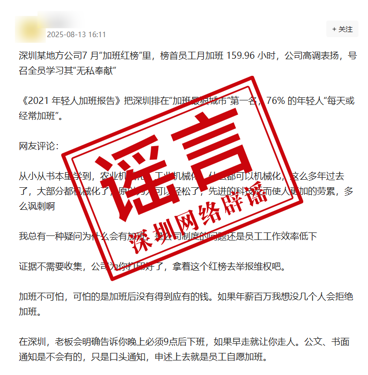 近日,一則《關(guān)于加班的通報表揚》在社交平臺引發(fā)熱議。部分網(wǎng)帖將涉事企業(yè)與深圳強行關(guān)聯(lián),冠以“深圳某公司”名義進行傳播,并稱深圳存在普遍的加班現(xiàn)象。經(jīng)核實,涉事企業(yè)非深圳企業(yè)。