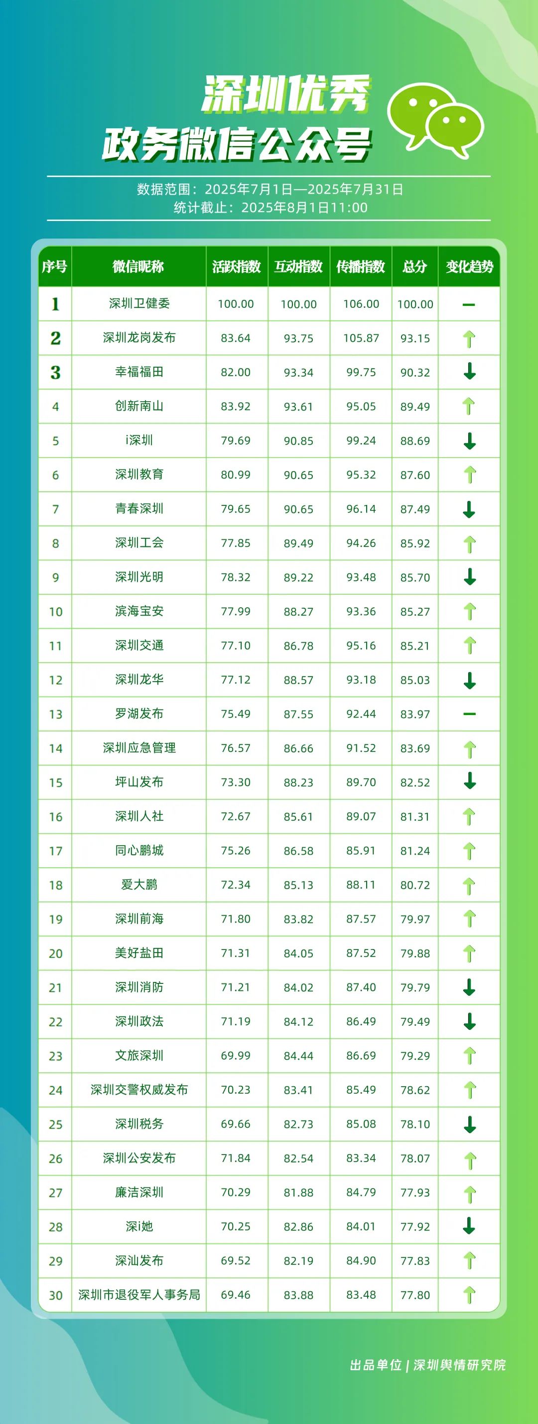 7月,30個(gè)政務(wù)微信公眾號(hào)入選“深圳優(yōu)秀政務(wù)微信公眾號(hào)”榜單,其中包括“深圳衛(wèi)健委”“深圳龍崗發(fā)布”“幸福福田”“創(chuàng)新南山”“i深圳”“深圳教育”“青春深圳”“深圳工會(huì)”“深圳光明”“濱海寶安”等。7月,“深圳衛(wèi)健委”內(nèi)容專(zhuān)業(yè)性與傳播力優(yōu)勢(shì)穩(wěn)固,整體表現(xiàn)保持較高水平,位于榜首;“深圳龍崗發(fā)布”聚焦民生服務(wù)與區(qū)域活動(dòng)宣傳,實(shí)現(xiàn)傳播效果提升,位居第二;“幸福福田”表現(xiàn)同樣不俗,排名第三?!皠?chuàng)新南山”“深圳教育”“深圳工會(huì)”等也積極發(fā)布高質(zhì)量信息與服務(wù)內(nèi)容,能夠較好平衡內(nèi)容“質(zhì)”與“量”,排名有所提升。上榜微信公眾號(hào)依托特色優(yōu)勢(shì)深耕內(nèi)容創(chuàng)作,將優(yōu)質(zhì)內(nèi)容作為核心支撐,成為政務(wù)傳播領(lǐng)域的優(yōu)秀典范。