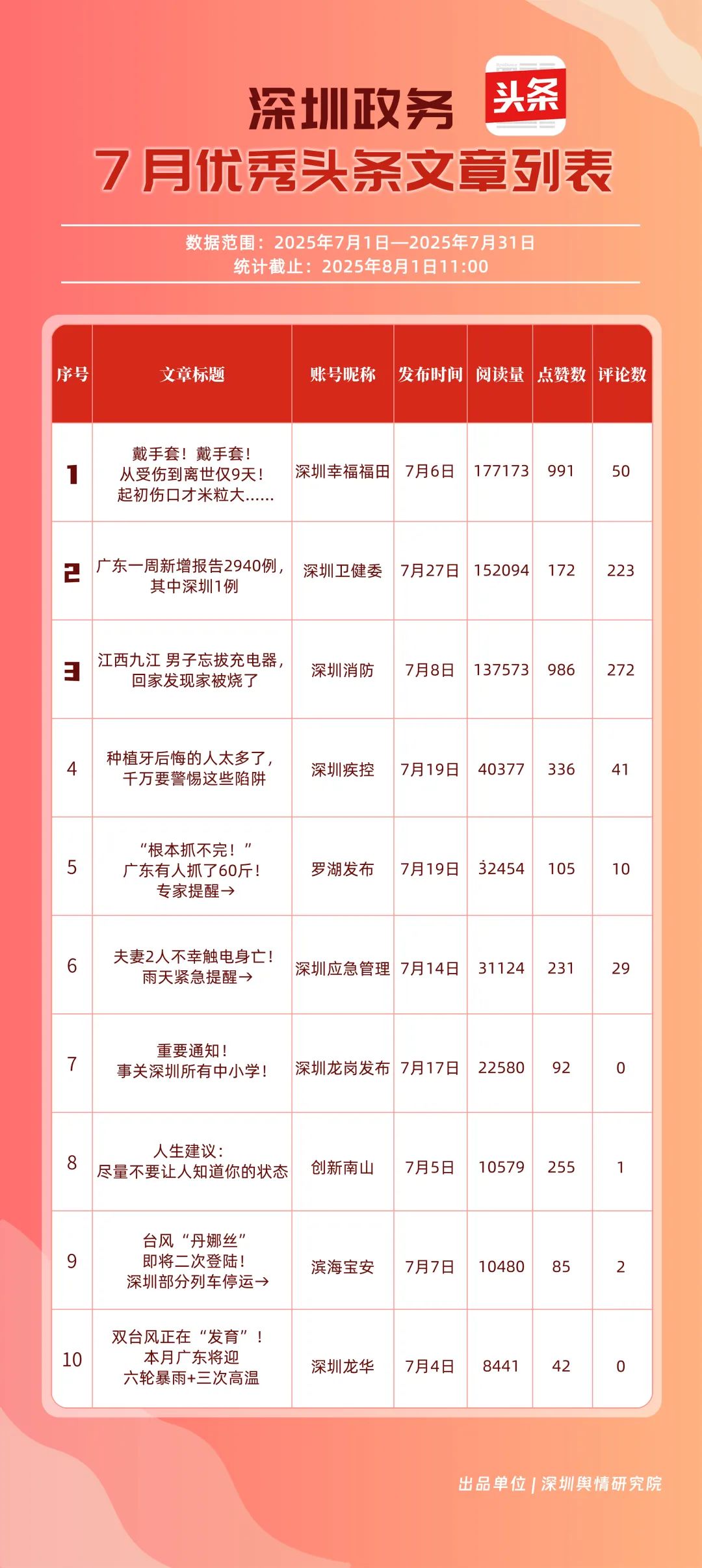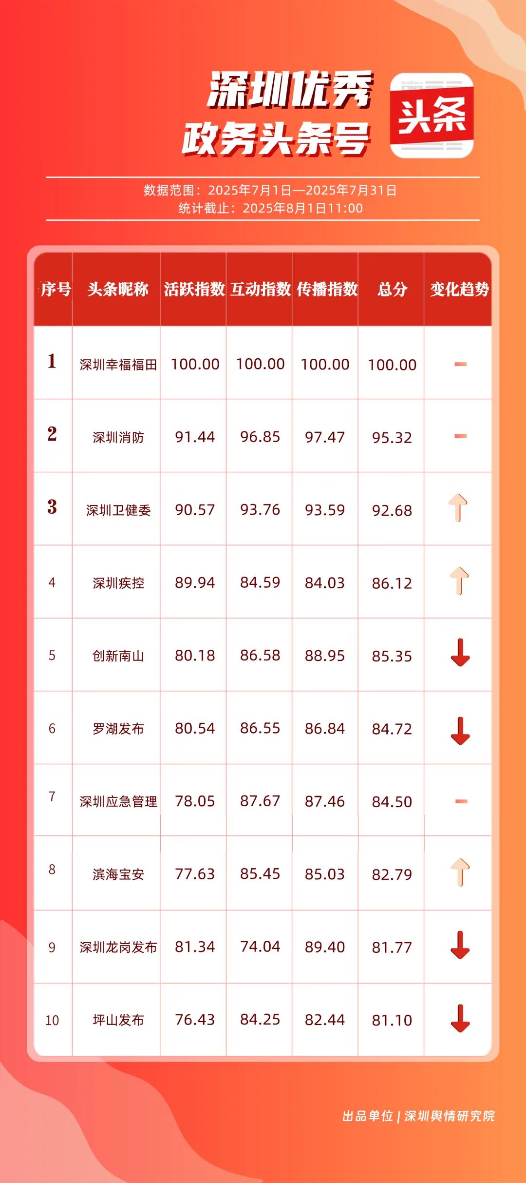 7月,“深圳幸福福田”“深圳消防”“深圳衛(wèi)健委”“深圳疾控”“創(chuàng)新南山”“羅湖發(fā)布”“深圳應(yīng)急管理”“濱海寶安”“深圳龍崗發(fā)布”“坪山發(fā)布”共10個(gè)政務(wù)頭條號(hào)入選“優(yōu)秀政務(wù)頭條號(hào)”榜單。“深圳幸福福田”“深圳消防”憑借優(yōu)質(zhì)內(nèi)容持續(xù)吸引用戶(hù)關(guān)注,穩(wěn)居前二;“深圳衛(wèi)健委”表現(xiàn)亮眼,評(píng)分達(dá)92.68分,排名較6月有所上升;“深圳疾控”同樣進(jìn)步明顯,在疾病預(yù)防控制信息傳播上發(fā)揮了重要作用?!皠?chuàng)新南山”“羅湖發(fā)布”“深圳應(yīng)急管理”等上榜賬號(hào),也各展所長(zhǎng),始終將優(yōu)質(zhì)內(nèi)容作為核心抓手,成為政務(wù)新媒體領(lǐng)域內(nèi)容創(chuàng)作與傳播的典范。