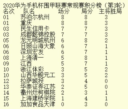 2020華為手機(jī)杯中國圍棋甲級(jí)聯(lián)賽第三輪深圳宏發(fā)3:1浙江體彩。具體戰(zhàn)況如下: