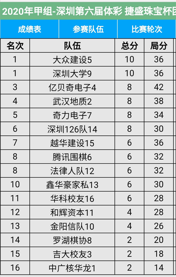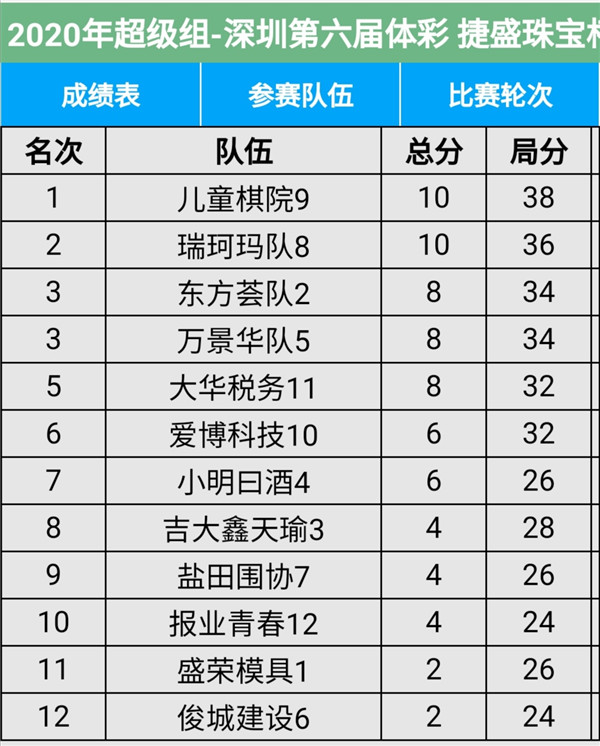 見圳客戶端?深圳新聞網2020年11月8日訊(記者周錦春)第六屆“體彩?捷盛珠寶杯”深圳市圍棋聯(lián)賽繼續(xù)在羅湖區(qū)藝嘉大酒店展開,今天是第二場,有第4輪至第6輪的比賽。目前,超級組中,兒童棋院隊、瑞珂瑪隊領先;甲級組中,大眾建設、深圳大學領先。具體賽程結果請看本文附后表格。