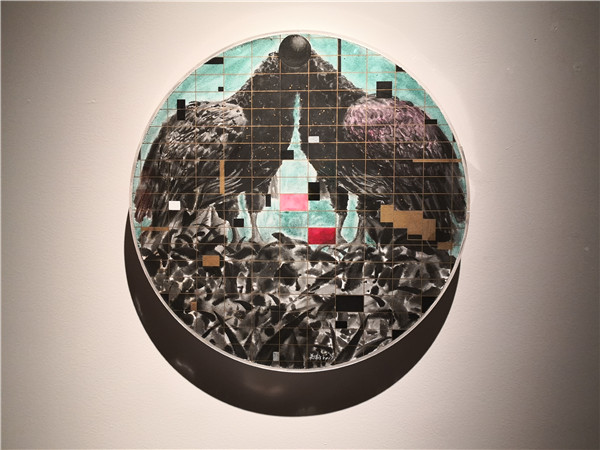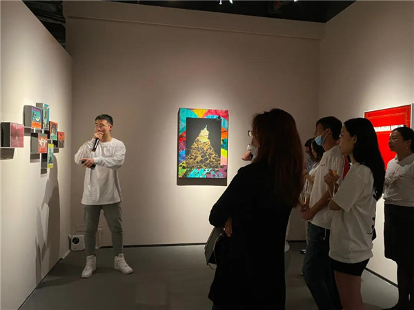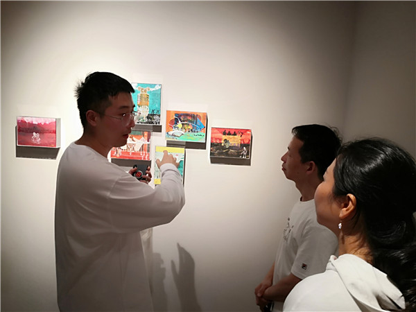 聯(lián)展現(xiàn)場(chǎng)三位作者向參觀者介紹創(chuàng)作經(jīng)歷及畫(huà)作意蘊(yùn)。