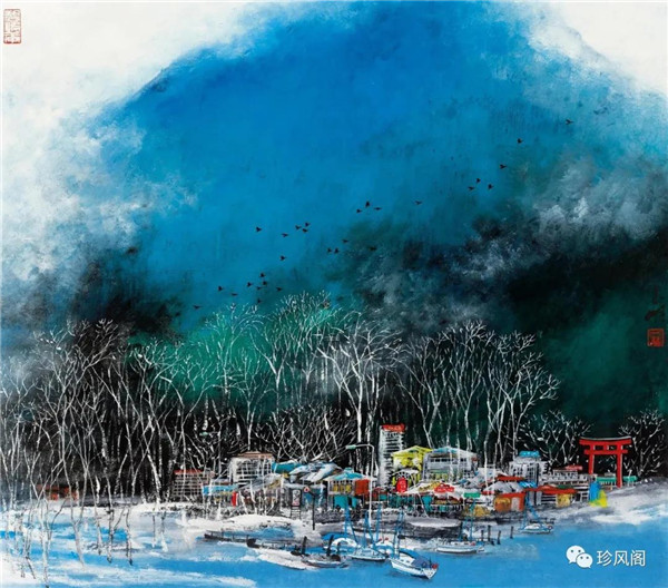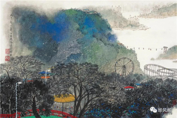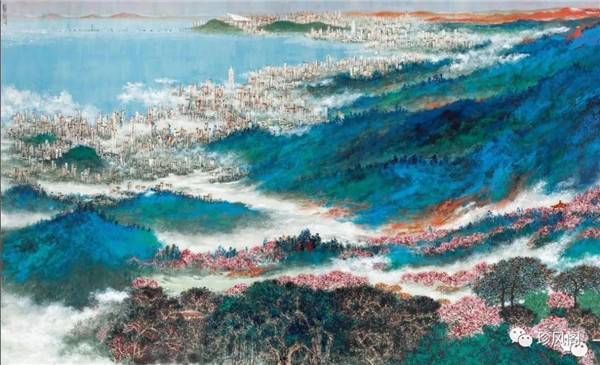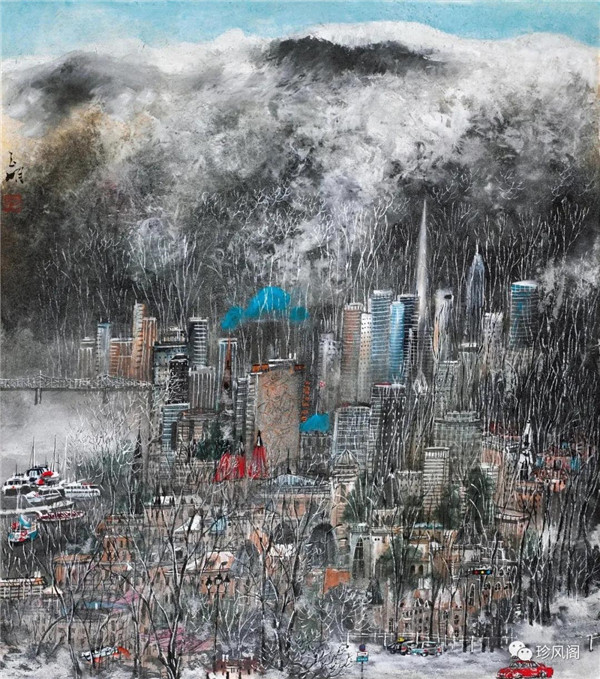 宋玉明從金陵畫派的新傳統(tǒng)跨越到城市表現(xiàn)的積彩拓墨畫法,既體現(xiàn)了現(xiàn)代化城市對(duì)于變革傳統(tǒng)的時(shí)代訴求,也體現(xiàn)了他移居深圳后這座新興城市文化對(duì)于他的深刻影響。畢竟,連續(xù)數(shù)屆的深圳水墨雙年展對(duì)于水墨在跨文化中重要作用與表現(xiàn)方法的突破,都給予他至深的思想開拓。這表明,城市山水畫已不單純是用中國(guó)畫表現(xiàn)城市的命題,而是其中能夠蘊(yùn)含多少城市文化觀念與城市審美的方法,宋玉明對(duì)于城市山水畫的探索,體現(xiàn)的正是這樣一種對(duì)城市現(xiàn)代文化的思想融合性。而不拘謹(jǐn)于城市一磚一石、一街一道、一房一樓的描繪,著眼于發(fā)揮水墨與彩墨表現(xiàn)的自由性,抑或體現(xiàn)了人性、自然與現(xiàn)代城市共同作用的現(xiàn)代生活方式與人文理想。的確,純粹用中國(guó)畫或水墨畫來(lái)探索城市的現(xiàn)代化景觀表現(xiàn),也許只是淺層次的審美需求;而只有當(dāng)把山水畫作為人與自然和諧統(tǒng)一的觀念表達(dá)植入城市現(xiàn)代化的審美訴求時(shí),城市山水畫才能真正凸顯出其深刻的美學(xué)價(jià)值。這正是我們從宋玉明的作品里能夠讀解到的他對(duì)于城市山水畫審美理想的一種勾畫。