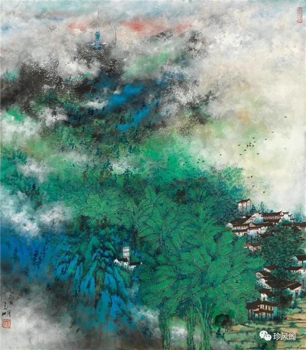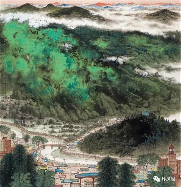 來(lái)自南京而定居于深圳的宋玉明,試圖將新金陵畫派表現(xiàn)現(xiàn)實(shí)的變革精神用于現(xiàn)代城市山水畫的探索上。作為新金陵畫派的第二代畫家,宋玉明直接承傳了宋文治表現(xiàn)現(xiàn)代太湖人居環(huán)境秀潤(rùn)而精巧的家法,并將此種大山景加小民居的畫法轉(zhuǎn)用到深圳城市形態(tài)的表現(xiàn)上。這里,我們一方面可以看到深圳作為一個(gè)新興的現(xiàn)代城市借山而筑、注重自然環(huán)境在城市生態(tài)建設(shè)上的積極作用;另一方面,深圳這種與自然相統(tǒng)一的現(xiàn)代化城市建設(shè)理念,也為宋玉明進(jìn)行城市山水畫創(chuàng)作提供了完美的表現(xiàn)對(duì)象。在《深圳文錦渡》等作品里,我們看到了畫家巧妙地將城市現(xiàn)代建筑與自然山水融為一體的表現(xiàn)。這些畫作,大多以勾線渲染的方法表現(xiàn)遠(yuǎn)景中的商用或市政建筑設(shè)施,也因這些建筑被設(shè)置在中遠(yuǎn)景,不僅減少了建筑塑造的困窘,而且突出了這些人居建筑與自然相得益彰的和諧關(guān)系。這些畫作,從嚴(yán)格的意義上說(shuō),仍然是山水畫,而宋式小散鋒皴以及云煙雨霧的渲染,也為畫面增添了幽深、恬靜、高雅、平和的意趣與境界。這些畫作,讓我們所熟悉的城市從一個(gè)相對(duì)遙遠(yuǎn)的視角來(lái)觀看,既因距離產(chǎn)生了一種從未體驗(yàn)過(guò)的美感,也較好地體現(xiàn)了現(xiàn)代城市與自然占位的協(xié)調(diào)統(tǒng)一、舒適宜居的比例關(guān)系。