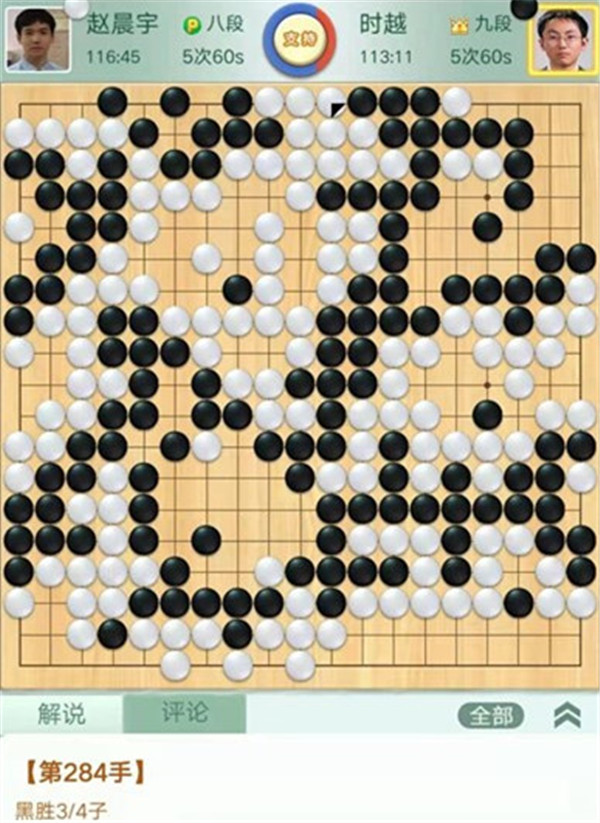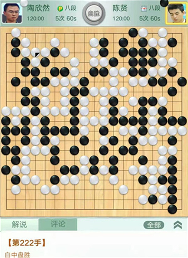今日比賽中,申旻俊主將執(zhí)黑對陣新二冠羋昱廷,開局左上角申旻俊配合小米使出羋氏飛刀,結(jié)果是飛刀不成功黑棋局面領(lǐng)先。中盤黑棋攻擊中央白棋時,白棋脫先搶占實(shí)地。被黑手起刀落斬殺大龍,局終??炱迮_,去年屢立戰(zhàn)功的戎毅七段執(zhí)白對陣黃云嵩七段,行棋穩(wěn)健,占居三個角之后,又在中間活出一大塊,行棋至194手勝。三臺陶欣然八段對陣陳賢八段,行棋222手白中盤勝。四臺時越九段對趙晨宇一戰(zhàn),行至284手,以四分之三子微弱優(yōu)勢取勝。