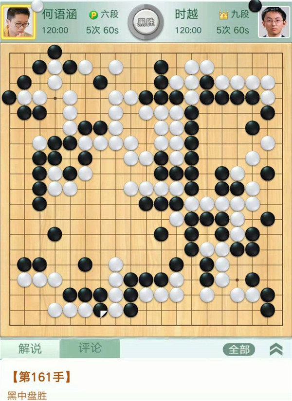 緊接著,一臺(tái)時(shí)越九段執(zhí)黑對(duì)何語(yǔ)涵六段干凈利落,時(shí)越在對(duì)局中充分發(fā)揮自身勢(shì)大力沉的棋風(fēng),以凌厲的屠龍刀法絕殺一條大龍,痛快淋漓地結(jié)束了戰(zhàn)斗。關(guān)鍵節(jié)點(diǎn)在中盤(pán),黑棋對(duì)右邊白子簡(jiǎn)單吃住尾巴則優(yōu)勢(shì),實(shí)戰(zhàn)黑棋追求整體殺白,白棋應(yīng)對(duì)失誤大龍憤死,行棋161手。