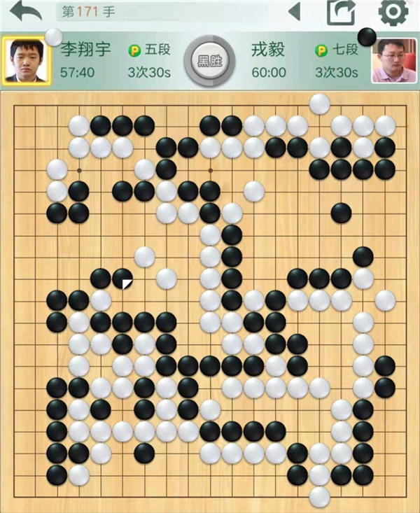 今日比賽中,三臺(tái)快棋戎毅執(zhí)黑對(duì)陣小將李翔宇,黑棋下方作戰(zhàn)失利早早進(jìn)入敗勢(shì)。后來(lái)白棋中央突然將自己大龍走死,黑棋幸運(yùn)獲勝,行棋171手。