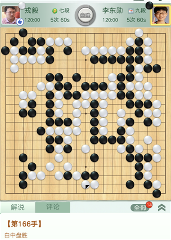 龍華隊(duì)戎毅七段本輪重新披掛上陣,執(zhí)白對(duì)陣韓國排名第四的李東勛。開局二十幾手時(shí),黑在左上出現(xiàn)重大失誤,白棋大幅領(lǐng)先。之后,白思路清晰,掌控局面,優(yōu)勢(shì)逐漸擴(kuò)大,而速勝。