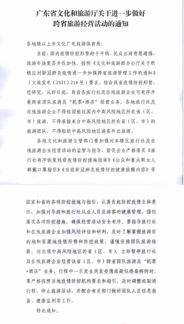 深圳新聞網(wǎng)2021年8月25日訊 (記者 田志強(qiáng))廣東省文化和旅游廳今日發(fā)布《關(guān)于進(jìn)一步做好跨省旅游經(jīng)營(yíng)活動(dòng)的通知》,通知明確:從即日起,我省各旅行社及在線旅游企業(yè)可有序開展跨省團(tuán)隊(duì)旅游及“機(jī)票+酒店”經(jīng)營(yíng)業(yè)務(wù)。各地旅行社及在線旅游企業(yè)不得組團(tuán)前往國(guó)內(nèi)中高風(fēng)險(xiǎn)地區(qū)所在?。▍^(qū)、市)旅游,不得承接來(lái)自中高風(fēng)險(xiǎn)地區(qū)所在省(區(qū)、市)的旅游團(tuán)隊(duì),不得組織中高風(fēng)險(xiǎn)地區(qū)游客外出旅游。
