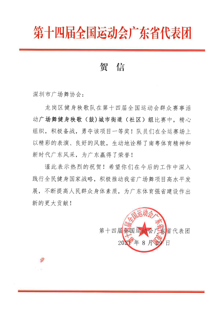 同時,廣東深圳隊在該項目視頻展演投票中獲得284790票,位居全國前列,奪“最佳人氣獎”。廣東省代表團向深圳市廣場舞協(xié)會發(fā)來賀信,對深圳隊奪得一等獎表示祝賀。