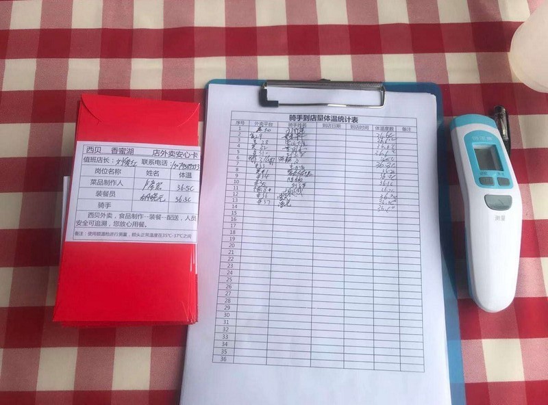 為了保障顧客和員工的健康,深圳西貝要求所有上班前的員工都需每半小時(shí)測一次體溫,每一個(gè)小時(shí)集中進(jìn)行洗手消毒,公司還為每一位員工配備了符合要求的防護(hù)口罩。不僅如此,來外賣取餐的騎手也和店員分割開在店門口取餐,減少人員之間相互交流與接觸,每個(gè)騎手取餐前,必須接受體溫測量,手部消毒,確認(rèn)無誤,才可取餐。
