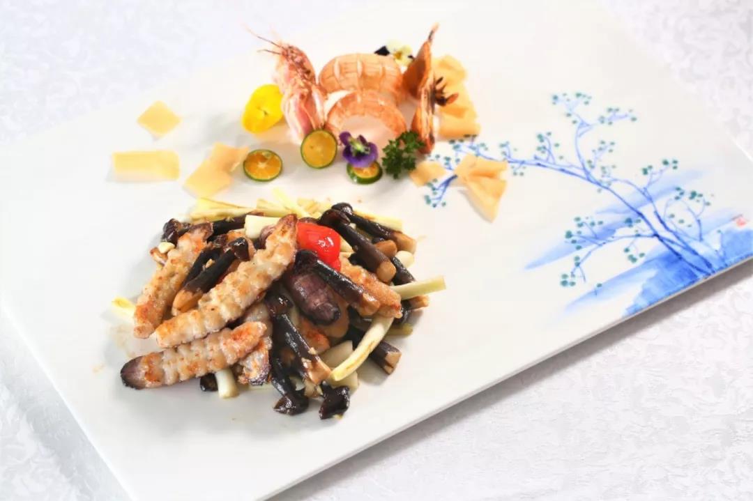 皮皮蝦焯熟以后過(guò)冰,剪去邊緣的刺,再完整拆出肉來(lái),拍上少許味料與生粉,煎到兩面呈金黃色。然后加入蕎菜翻炒片刻即可。除了這二者之外,還會(huì)配爽口的黑雞樅。