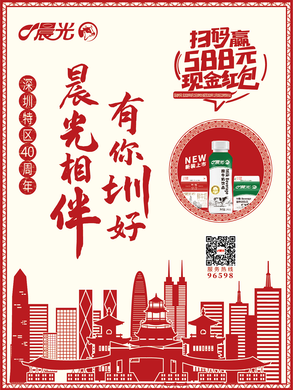 見圳客戶端·深圳新聞網(wǎng)2020年8月25日訊 作為深圳本土的國營乳制品公司,晨光乳業(yè)以“深圳特區(qū)40周年,晨光相伴,有你圳好”為主題,致敬深圳經(jīng)濟特區(qū)建立40周年。作為一家“深圳老字號”品牌企業(yè),晨光乳業(yè)以40周年為契機,推出全新升級包裝的240g酸牛奶飲品以及掃碼贏588元紅包等多個主題活動,在與千萬深圳市民分享晨光40年的喜悅之情的同時共慶深圳經(jīng)濟特區(qū)成立40周年!