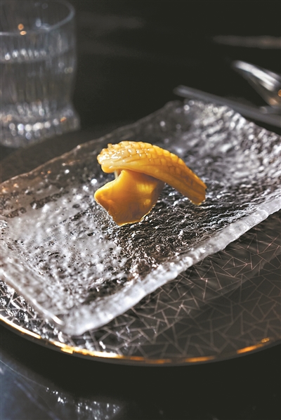 湯焯乃雞油焯響螺。1斤1只的響螺去殼與頭后,凈肉僅僅2兩。切成片狀的響螺經(jīng)過(guò)定時(shí)低溫慢煮后,淋上剛剛滾起的熱雞油,上碟時(shí),它旁邊跟著一灘其貌不揚(yáng)的醬汁,那便是紫蘇醬。響螺配紫蘇,勾起人們對(duì)中秋的紫蘇炒田螺的味覺(jué)記憶。油焯的風(fēng)味靈感源自蒜香骨這道傳統(tǒng)粵菜,取蒜香味結(jié)合魚(yú)露醬,融入花膠天婦羅之中。將花膠以天婦羅的方式展現(xiàn),這也是大膽的嘗試。味焯的做法則讓人更熟悉,立馬想起前些年風(fēng)靡廣州的鹵水火鍋來(lái)。獅頭鵝的鵝肝在鹵水里泡著溫泉,時(shí)間一到才起身,并不太咸,香濃恰好。還有汽焯,是用最當(dāng)造的大黃花魚(yú),將整個(gè)迷你小蒸籠搬到面前來(lái),現(xiàn)蒸現(xiàn)吃,7分鐘,嫩度正好。火焯則是燒烤澳大利亞和牛肉的燒烤方式,這最原始的烹飪方式里夾著迷迭香和百里香的誘人香氣。而這每一道菜肴,僅僅數(shù)口的分量,道道位上,分量恰到好處,避免了餐桌上的浪費(fèi)。