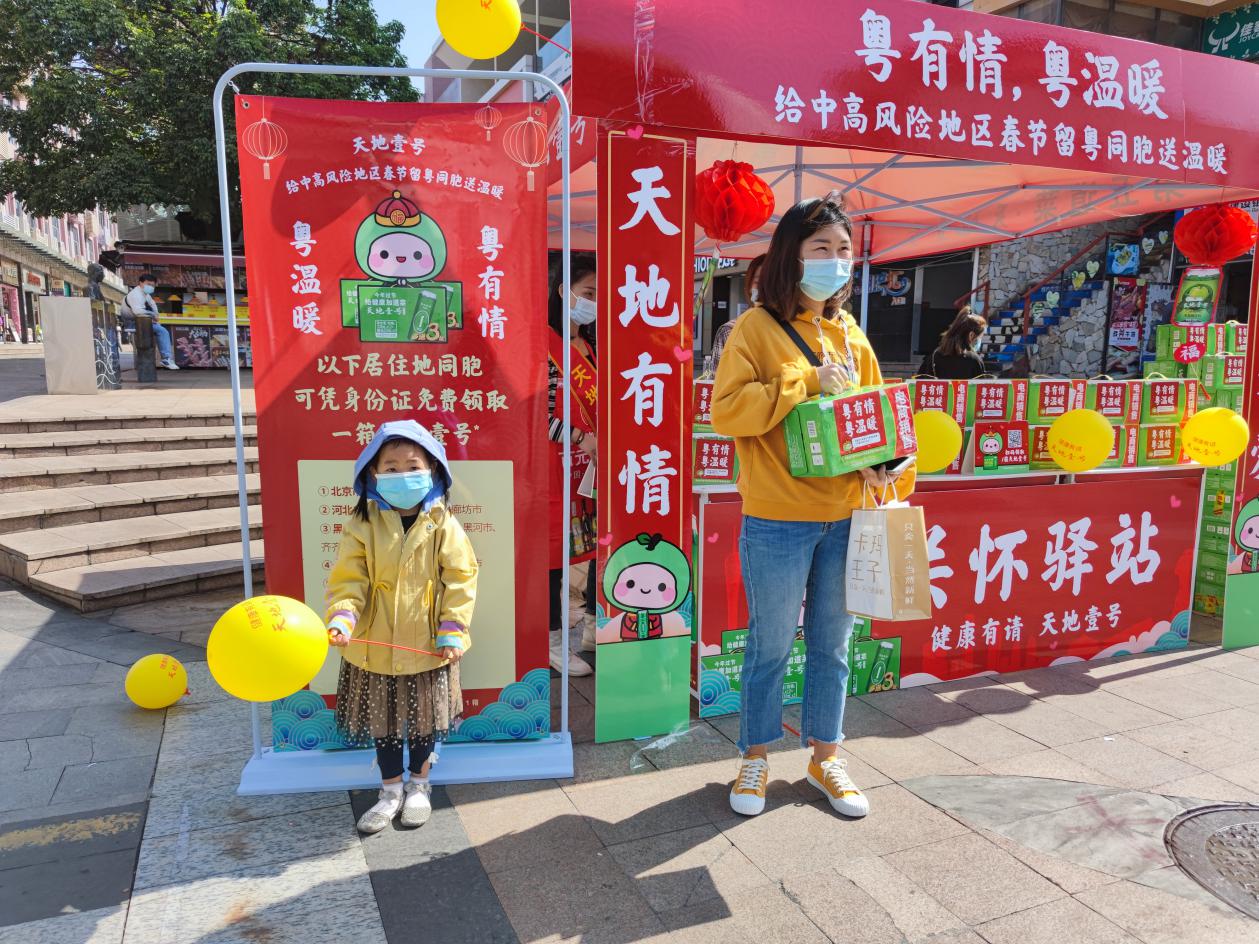 據(jù)了解,天地壹號在廣東市場開展的“粵有情粵溫暖”公益活動,2月1日至2月3日,將在廣州、深圳、東莞、佛山、中山、珠海、惠州等7個珠三角城市22個區(qū)鎮(zhèn)的中心地帶開設(shè)“關(guān)懷驛站”,共準(zhǔn)備了近3萬份健康禮包。“我們在京東還準(zhǔn)備了2000萬元的親情補(bǔ)貼券,如果大家想家了,可以領(lǐng)取這份親情補(bǔ)貼,為家人寄去思念和祝福?!鄙鲜鲐?fù)責(zé)人說。