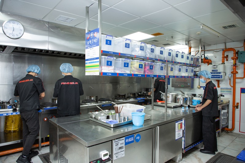 當天,走進胖哥倆肉蟹煲的門店,門口的大屏幕上用四個角度播放著后廚的監(jiān)控錄像。在進入后廚前,媒體和粉絲們帶好口罩、戴上帽子,用消毒液給雙手進行消毒,分批進入后廚進行參觀。