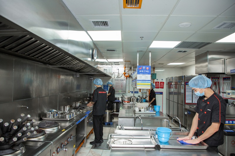 “右手邊是冷菜間,因為食安要求更高,我們都有專門的‘二次更衣室’,在這里更換衣服后,再進入對涼菜進行處理?!必撠熑吮硎?,在專門的涼菜區(qū)里,則可以看到櫥窗中整齊地貼上了諸如“A1圣女果”“B04魚豆腐”之類的標簽,同時備注“當天生產(chǎn)打烊廢棄”和“加工日期與廢棄日期”等具體操作指示?!懊客泶蜢群?,我們也會用紫外線燈對冷菜間進行半個小時的消毒?!必撠熑搜a充。
