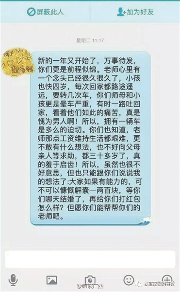 爆料帖中同時(shí)上傳了多張聊天記錄,其中一張顯示:“新的一年又開(kāi)始了,萬(wàn)事待發(fā),你們更是前程似錦。老師心里有個(gè)念頭已經(jīng)很久了,小孩也快四歲了,每次回家都路途遙遠(yuǎn),要轉(zhuǎn)幾次車(chē),你們師母和小孩更是暈車(chē)嚴(yán)重,有時(shí)一路吐回家,看看他們?nèi)绱送纯啵媸抢槟腥税?!所以,擁有一輛車(chē)是多么的迫切。你們也知道老師那些工資維持生活都很艱難,更不敢有什么想法,也不好向父母親人求助,都三十多歲了,真的羞于啟齒!所以,雖然也很不好意思,但是也只能跟你們說(shuō)說(shuō)我的想法了:大家如果有能力的,可不可以慷慨解囊一兩百塊,等你們哪天結(jié)婚了,再給你們打紅包怎么樣?但愿你們能幫幫你們的老師吧?!?/p>