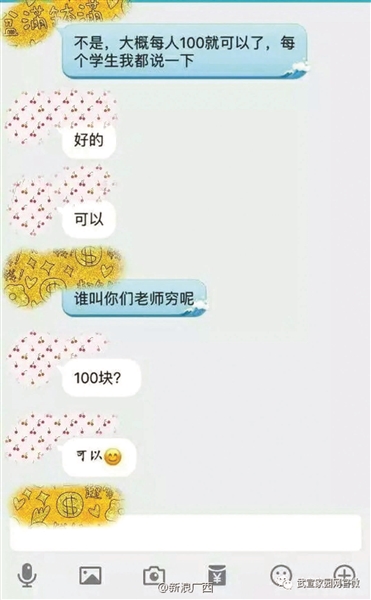 在被曝光的聊天記錄中,該老師曾表示,“大概每人100就可以了,每個(gè)學(xué)生我都說(shuō)一下?!辈⒔忉屨f(shuō),“誰(shuí)叫你們老師窮呢?”聊天記錄顯示,群內(nèi)多名學(xué)生回復(fù)稱(chēng),“可以?!?/p>