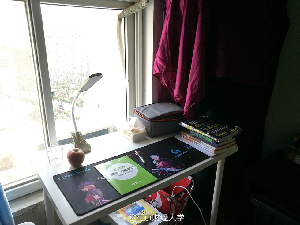 綿綿的草坪、充滿設(shè)計感的書架、掛著素描畫的墻……難以想象這是四個19歲男生的寢室。南京財經(jīng)大學(xué)西苑9幢男生宿舍頂樓602寢室,住著4位“世外高人”—— 涂貴平、柯毅、劉以康和廉鎮(zhèn)宇,他們用事實告訴大家,男生宿舍文藝起來,可絲毫不輸女生。