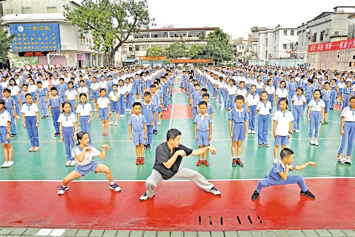 當天,利用課間陽光體育的時間,蠔業(yè)小學1000余名學生在校內(nèi)饒有興趣地接受了華林派武術(shù)操的教學,華林螳螂拳代表性傳承人冼潤長師傅詳細地講解了武術(shù)操,并實地示范。華林派武術(shù)操是“華林螳螂拳”代表性傳承人冼潤長針對青少年所創(chuàng)編,融入了螳螂拳的武術(shù)元素,深受學生的歡迎?;顒硬粌H讓孩子深入了解優(yōu)秀傳統(tǒng)文化,還讓孩子“武”起來,益于舒緩學習壓力。