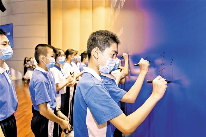 “自覺遵守互聯(lián)網(wǎng)相關(guān)政策和法律法規(guī),積極培育和踐行社會(huì)主義核心價(jià)值觀……”海韻學(xué)校的學(xué)生們現(xiàn)場(chǎng)朗讀《寶安青少年“文明上網(wǎng)·健康成長”倡議書》,并在承諾墻上莊嚴(yán)地簽下自己的名字。