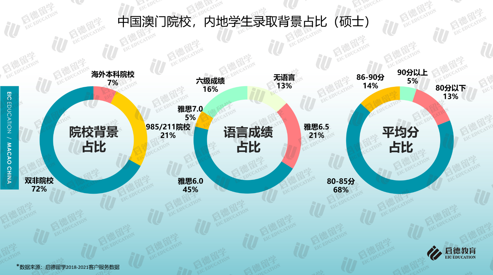 本科錄取中,澳門大學的要求較高,應(yīng)屆高考生申請人高考成績要達到一本線;碩士錄取中,只有澳門大學和澳門旅游學院要求碩士申請學生提交英語成績,雅思6分為澳門大學和澳門旅游學院的語言門檻要求,澳門大學碩士申請也可接受430分以上六級和TEM4/8成績;其它院校的大多數(shù)專業(yè)對英語成績無硬性要求。啟德留學2018-2021客戶服務(wù)數(shù)據(jù)顯示,2021年碩士錄取學生中,45%達到雅思6分的門檻成績,雅思成績6.5分以上達到26%,16%的學生只提供了合格的六級成績,13%為無語言錄取;七成以上的碩士錄取學生來自雙非院校;GPA在80分以上的占比為87%。