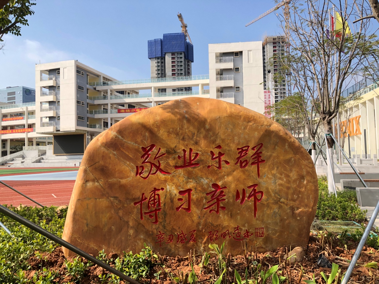 2021年底,學(xué)校啟用新東門,門右側(cè)墻壁上則是神采奕奕的校名:深圳市光明區(qū)鳳凰學(xué)校。經(jīng)東門而入校園,呈現(xiàn)在眼前的是一塊碩大刻石,其辭曰:敬業(yè)樂群,博習(xí)親師。